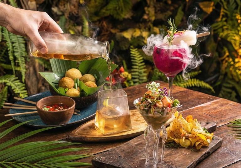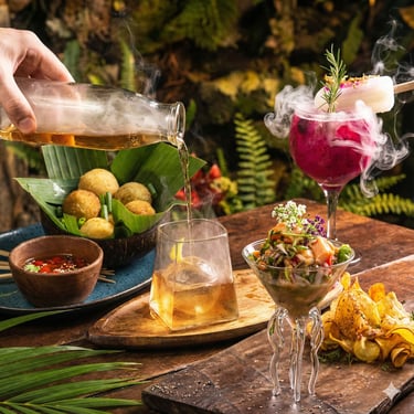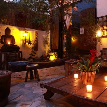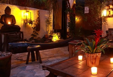 Tantra é um cenário asiático que integra jardim balinês, cascata e teto de bambu sob iluminação rústica. O ambiente é totalmente instagramável, exalando aromas de especiarias que elevam a experiência.