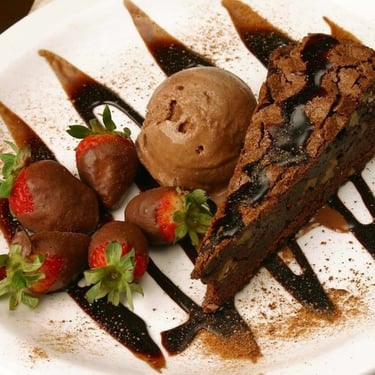 ✦ Sobremesa: Chocolate Fudge Brownie (R$ 33,90) Brownie denso de chocolate servido com sorvete de creme, farofa crocante e calda de chocolate.
