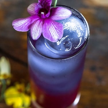✦ Drink Lúdico: Orquídea Selvagem (R$ 47,90) Vodka cítrica, licor de flor de sabugueiro, lichia, manjericão e orquídea comestível.