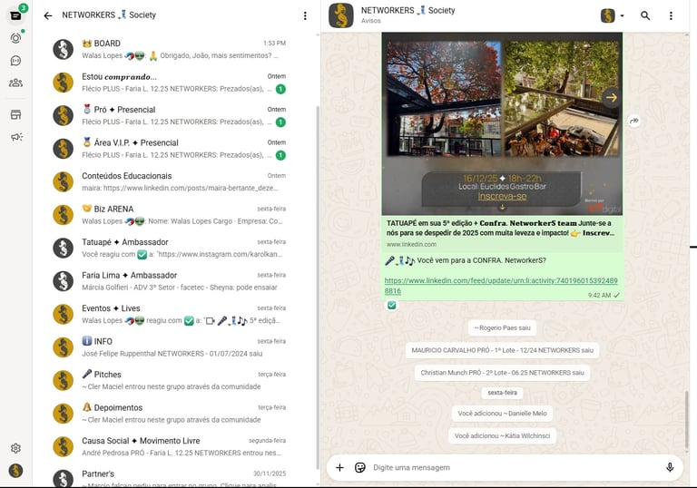 Convidados PRÓ acessam a lista atual. PLUS e PRIME acessam todos os encontros: +1K contatos com nome, cargo, empresa, e-mail, WhatsApp e o tipo de conexão buscada. Dados em prol de networking, proibido spam!