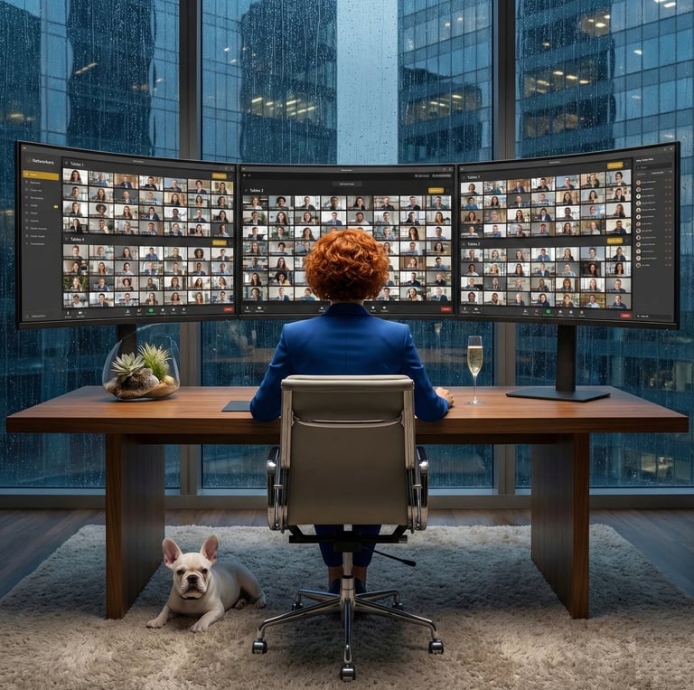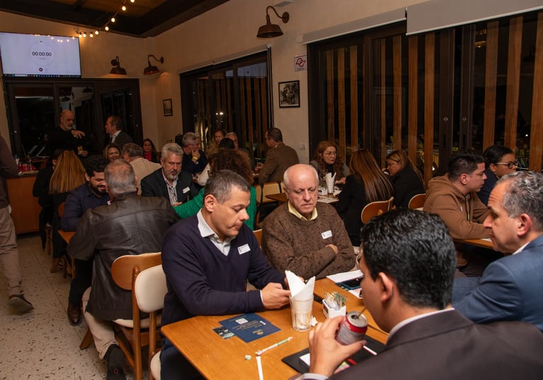 Amostra da Dinâmica V.I.P. na Área Pró. Sem análise prévia, foca em giros de mesa ágeis sem repetições. Ambiente desenhado para gerar negócios, insights e parcerias de alto valor de maneira instantânea.